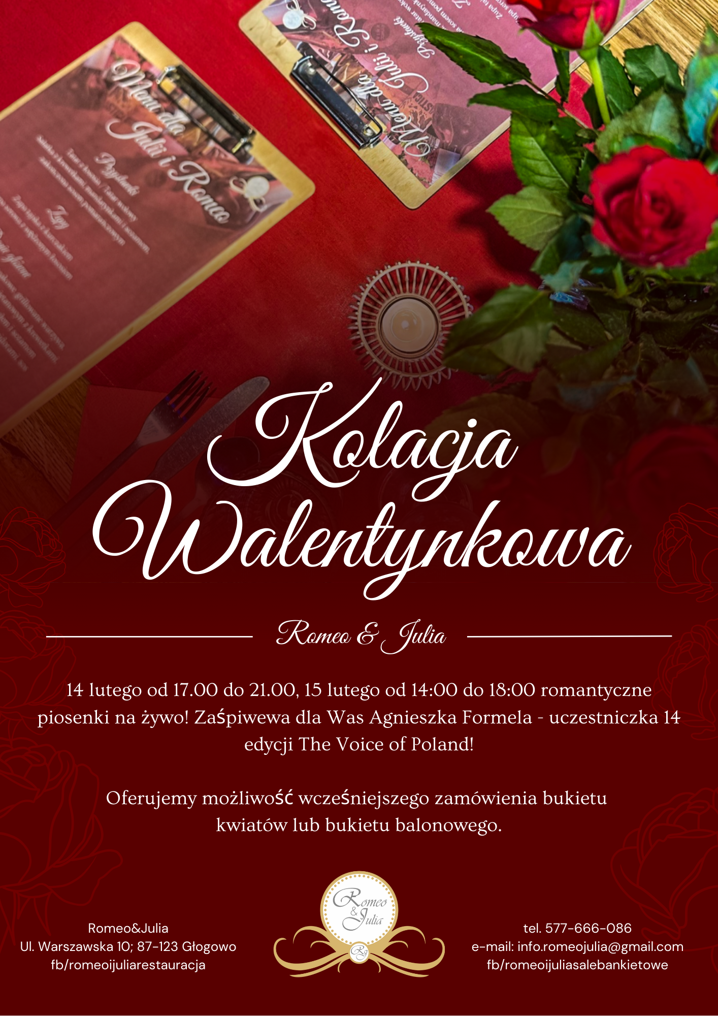 Świętuj Walentynki w naszej restauracji w wyjątkowej, romantycznej atmosferze. Przygotowaliśmy specjalne menu i niezapomniany wieczór z Agnieszką Formelą – uczestniczką 14. edycji The Voice of Poland. Zapraszamy na chwile pełne miłości i wyjątkowych doznań kulinarnych!
