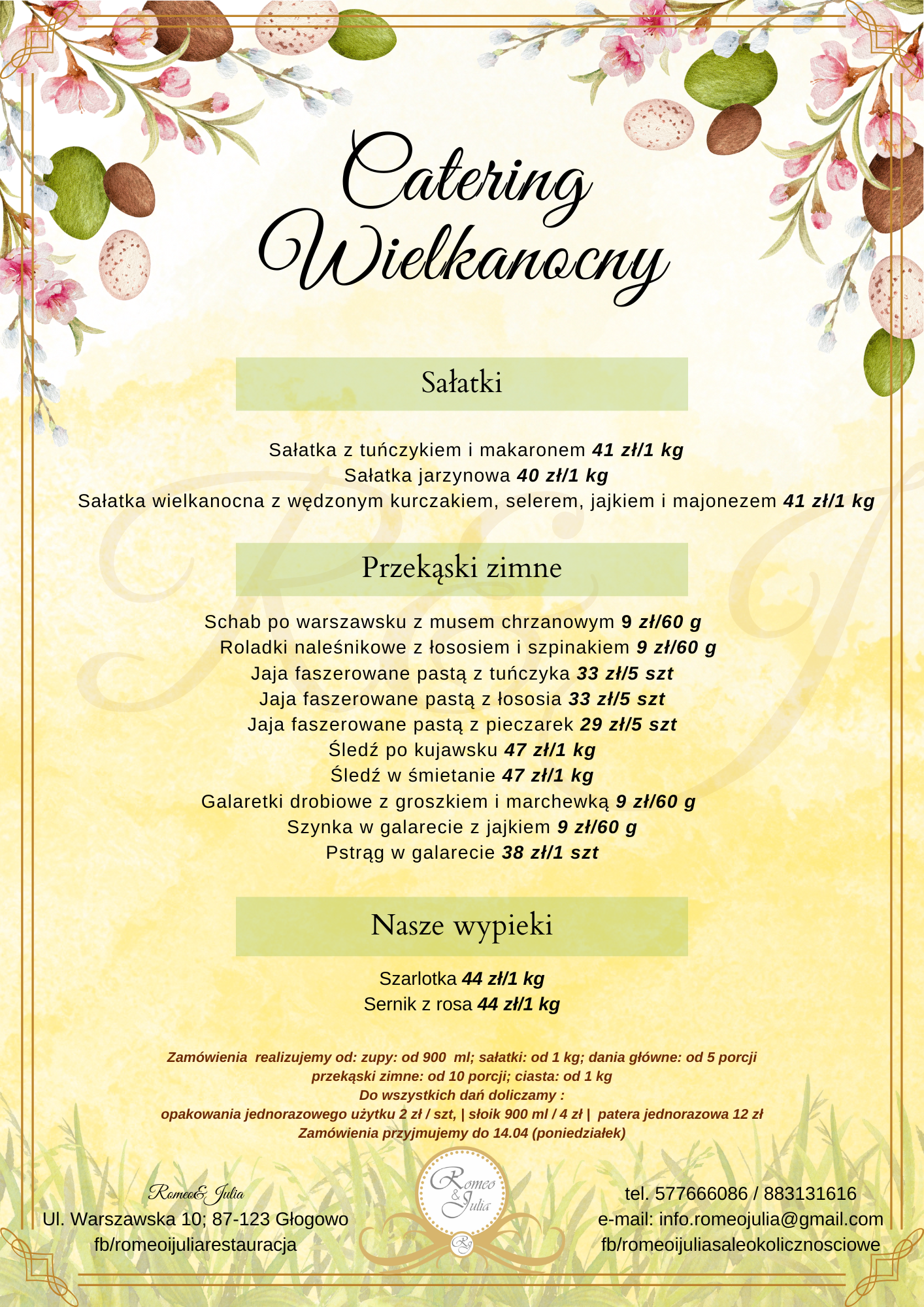 Nasz catering wielkanocny to idealne rozwiązanie, by cieszyć się świątecznymi potrawami bez stresu i pośpiechu. Zapewniamy świeżość, wysoką jakość i tradycyjny smak, który wprowadzi wyjątkową atmosferę do każdego świątecznego stołu. Z nami te Święta będą pełne radości i smaku, a Ty zaoszczędzisz czas, ciesząc się wspaniałymi chwilami w gronie najbliższych.
